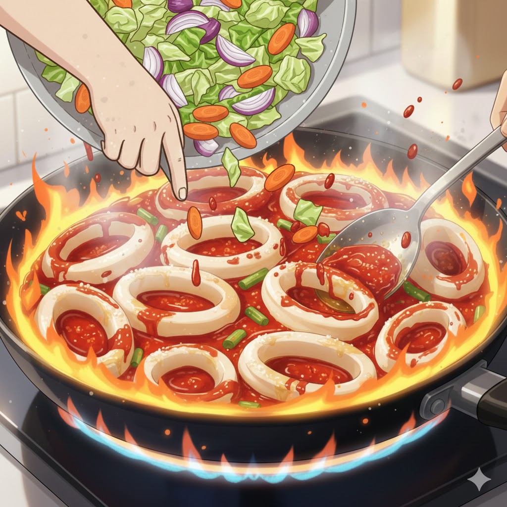 채소는 숨이 너무 죽지 않도록 센 불에서 빠르고 짧게 볶아내는 것이 핵심이에요. 그래야 아삭한 식감이 살아있어 쫄깃한 오징어와 잘 어울립니다. 채소에서 물이 나오기 전에 불을 끄는 것이 타이밍 싸움이죠!