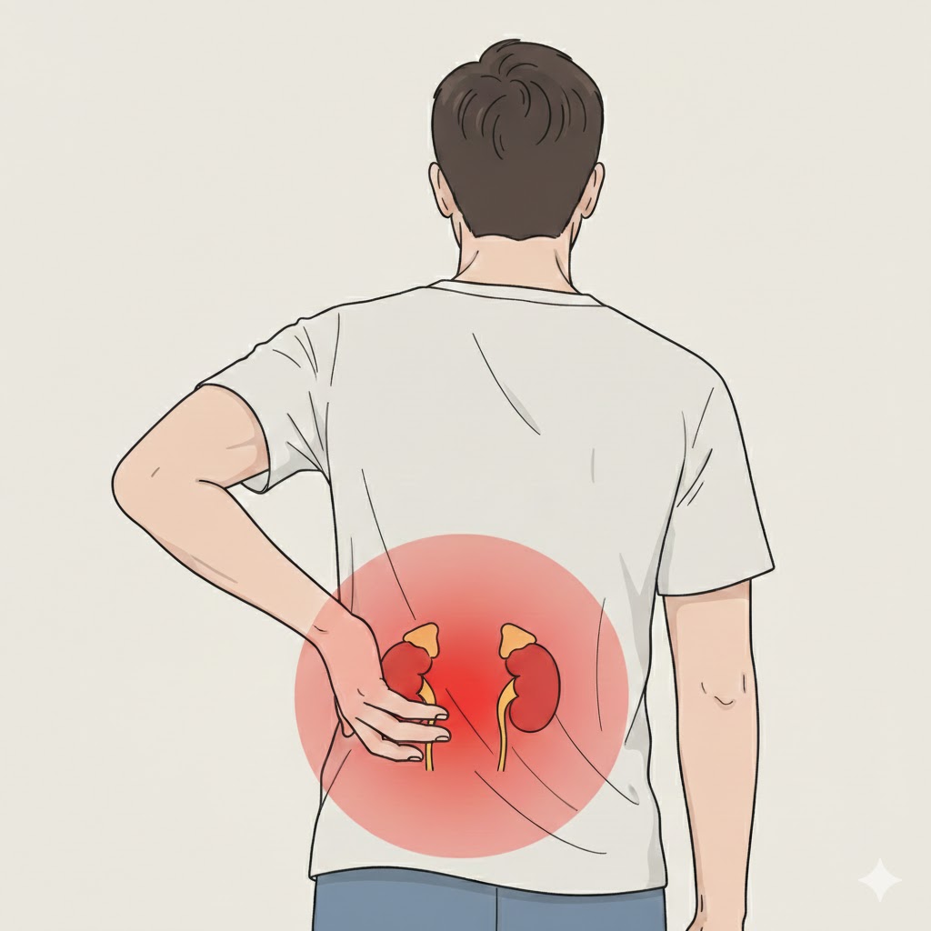 신장은 등 쪽, 갈비뼈 아래에 위치해 있습니다. 따라서 신장에 염증(신우신염)이 생기거나 결석이 생기면 허리나 옆구리 쪽에 심한 통증이 발생할 수 있습니다.