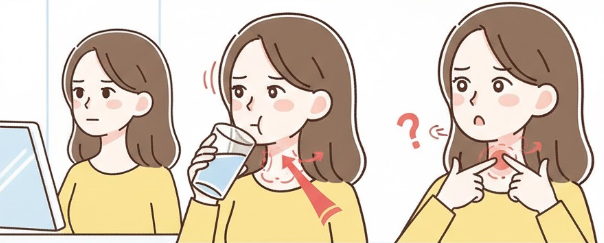 만약 침을 삼킬 때 목 앞쪽에서 뭔가 걸리는 느낌이 들거나, 딱딱한 혹이 위아래로 움직이는 게 느껴진다면 전문의의 진찰이 필요합니다.