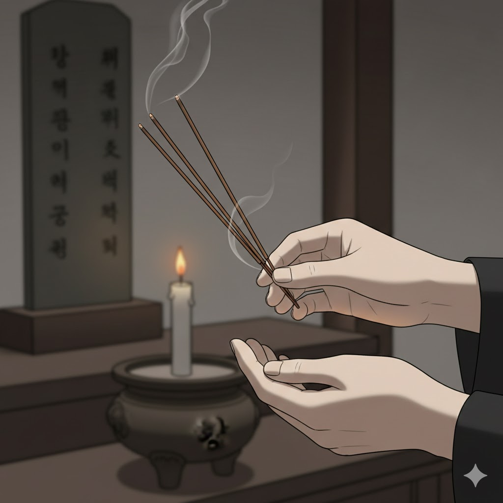 - 손의 위치 (공수): 평상시와 반대입니다. 흉사(안 좋은 일) 때는 남자는 오른손이 위로, 여자는 왼손이 위로 가게 포갭니다.