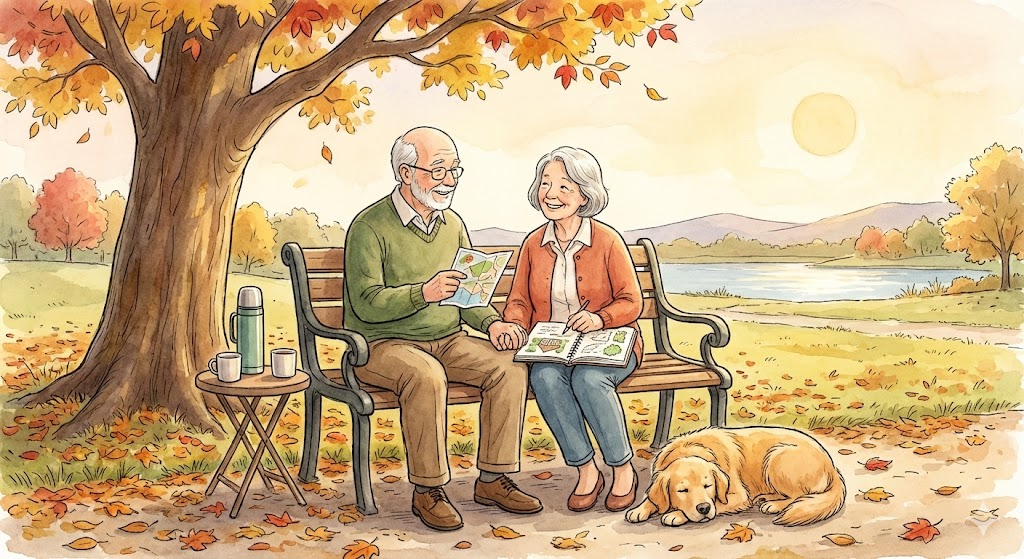 [일러스트 프롬프트: 노년의 부부가 여유롭게 공원 벤치에 앉아 미래를 설계하는 평온한 모습]