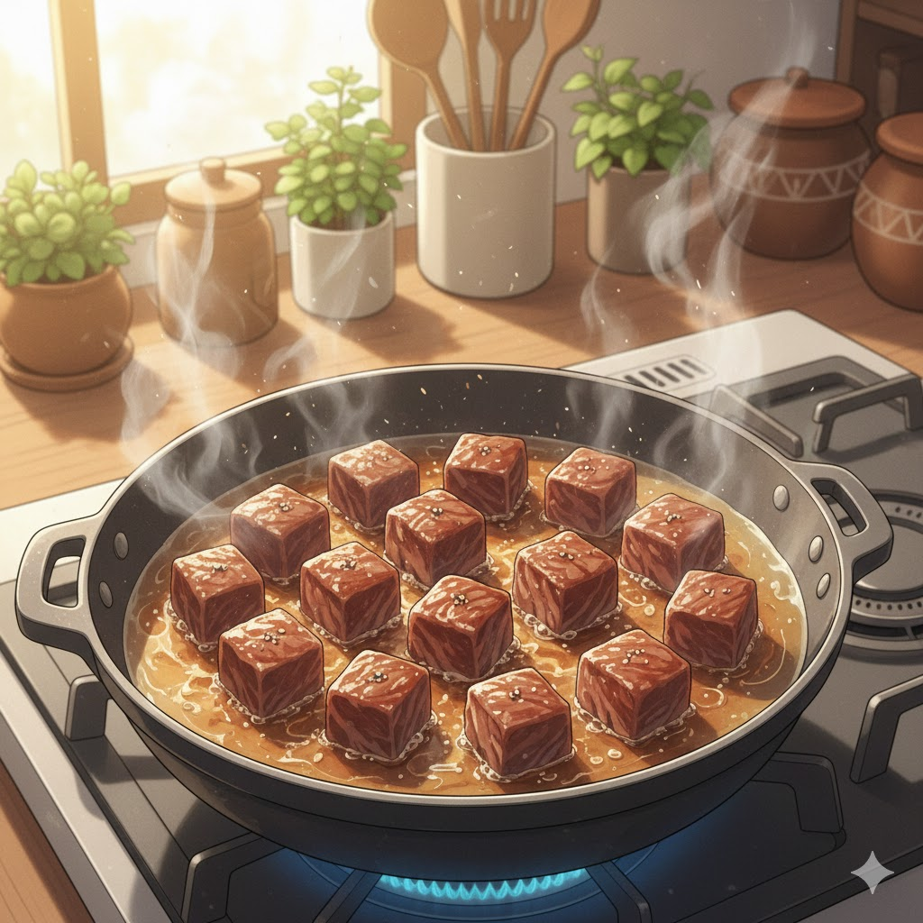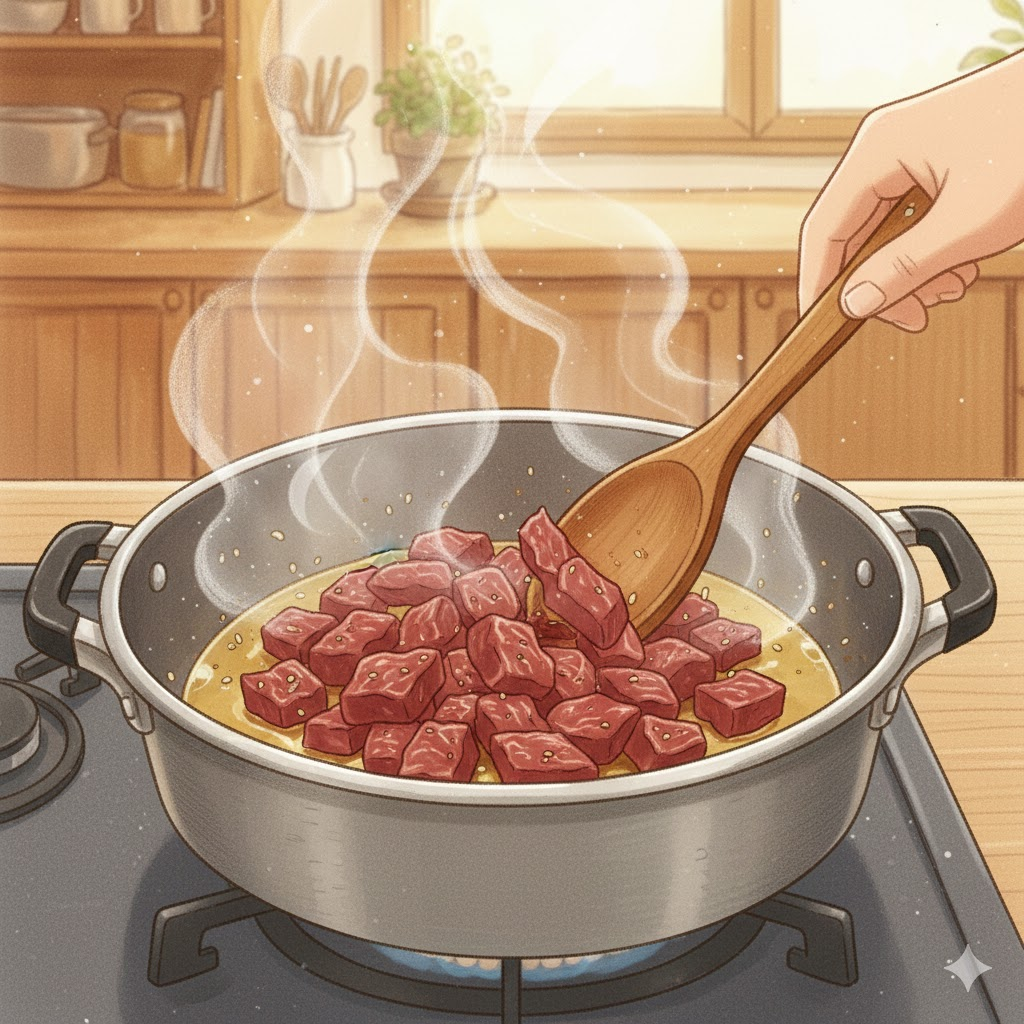 오늘은 가장 대중적이고 호불호 없는 **'소고기 볶음 방식'**을 기준으로 설명해 드릴게요. 냄비에 참기름 1큰술과 식용유 반 큰술을 두르고 핏물을 뺀 소고기(양지 또는 등심)를 넣어 볶아줍니다.