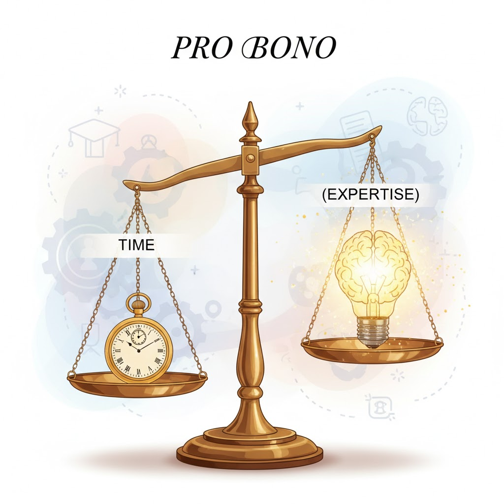 **프로보노(Pro Bono)**는 '공익을 위하여'라는 뜻으로, 전문가가 자신의 직무 전문성을 대가 없이 사회에 기부하는 활동을 말합니다. 법률뿐만 아니라 IT, 마케팅, 디자인 등 전 분야에서 가능하며, 사회 문제 해결은 물론 개인의 직무 성장과 네트워킹에도 큰 도움이 됩니다. 책임감 있는 태도로 당신의 재능을 가치 있게 나눠보세요!