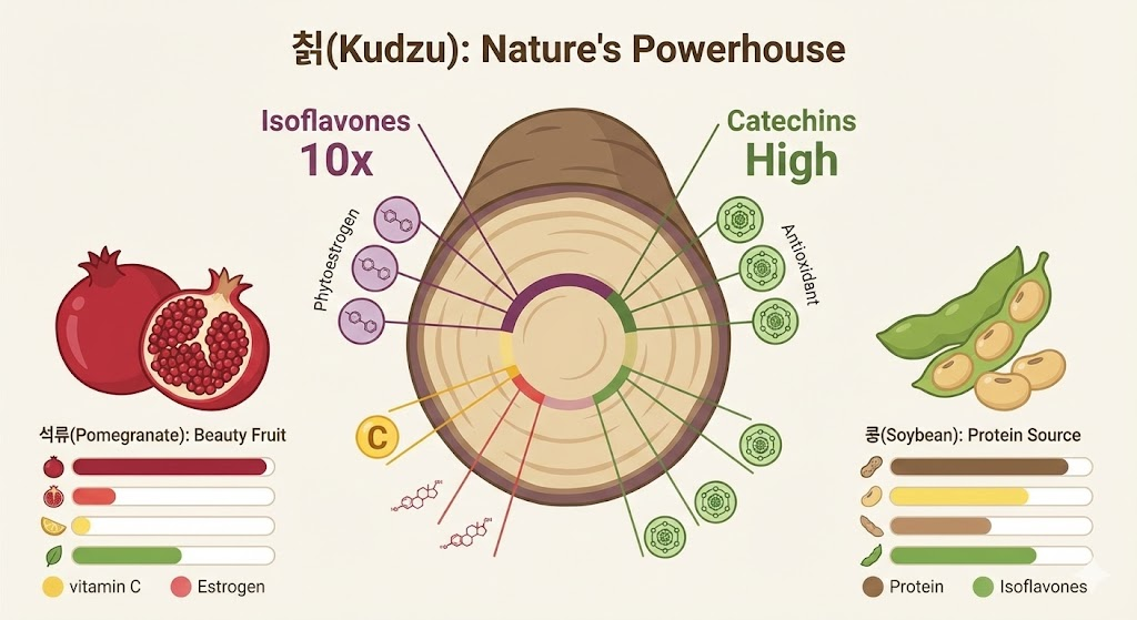 [핵심 요약] 칡즙은 석류보다 풍부한 이소플라본으로 갱년기 증상 완화와 골다공증 예방에 탁월합니다. 또한 카테킨 성분이 간 해독과 숙취 해소를 돕고 피부 미용에도 효과적입니다. 다만, 찬 성질이므로 하루 1~2포 식후 섭취를 권장하며, 본인의 체질에 맞춰 똑똑하게 즐기는 것이 중요합니다.