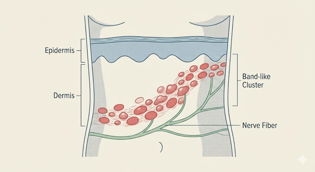 초기 통증이 시작되고 며칠 뒤, 통증이 있던 부위에 붉은 반점이 올라오기 시작합니다. 이때의 특징은 **'띠 모양'**으로 그룹을 지어 나타난다는 점이에요. 우리 몸의 신경은 척추에서 띠 모양으로 뻗어 나와 있기 때문에, 바이러스도 그 길을 따라 발진을 만듭니다.